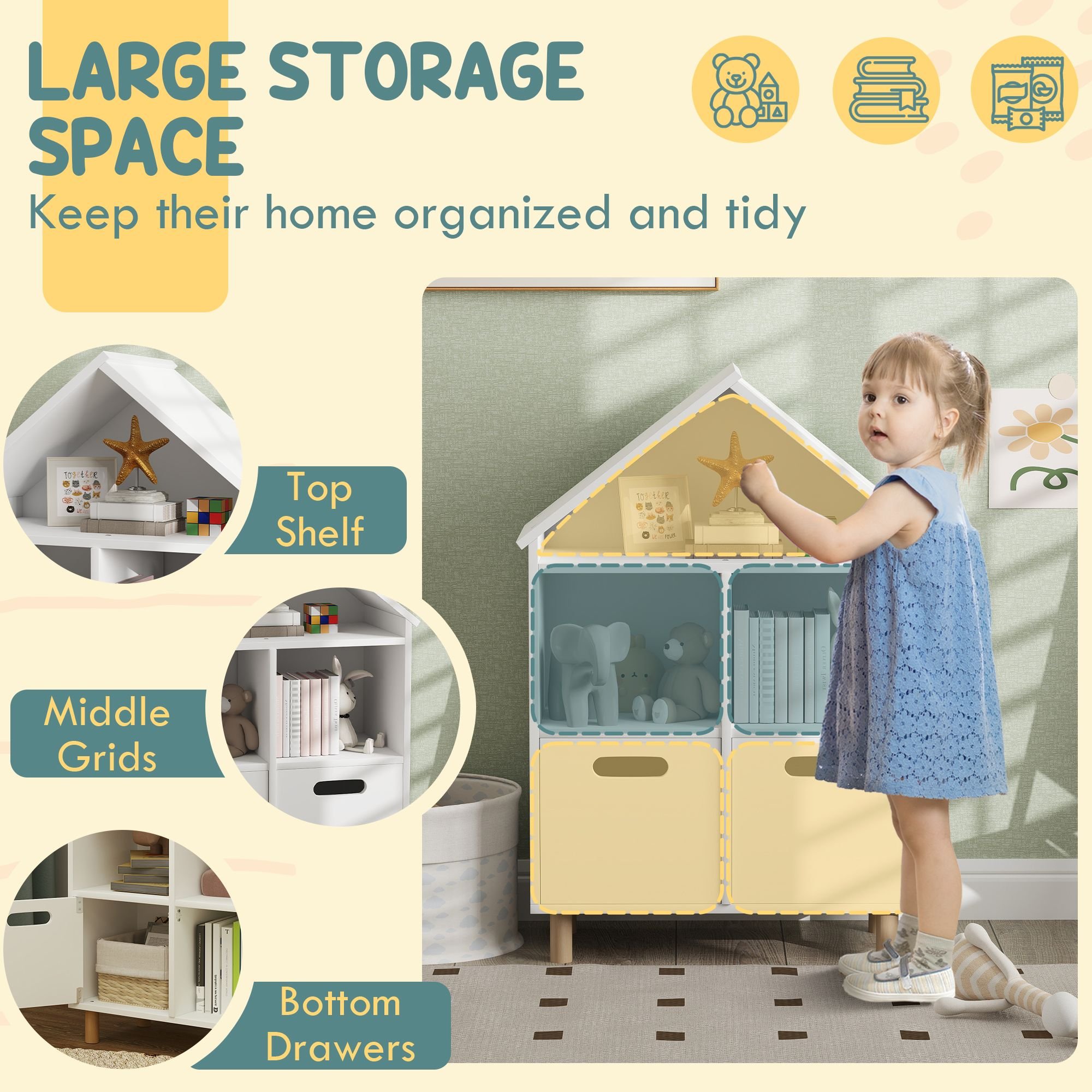 • Charming House Design: Styles to resemble a little house, this kids toy storage will complement your home decor delightfully, making it a charming addition to any nursery or playroom.