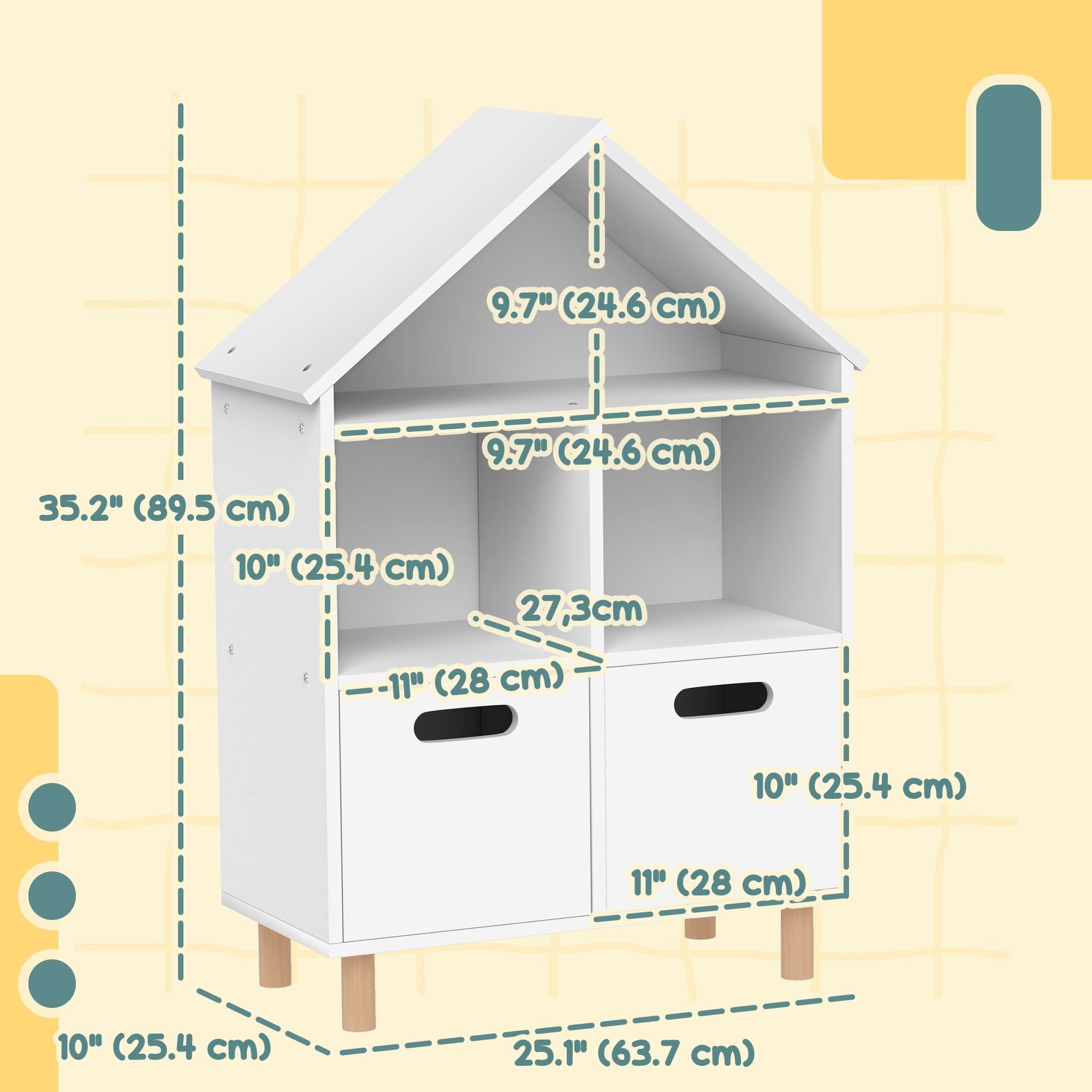 • Book Storage Info: Overall dimension: 25.1"L x 11.7"W x 35.2"H (63.7L x 29.7W x 89.5H cm). Maximum Load: 6.6 lbs (3 kg)(Each grid), 33 lbs (15 kg)(Total). Recommended Age: 3-8 years old. Standard: SOR. Assembly required.