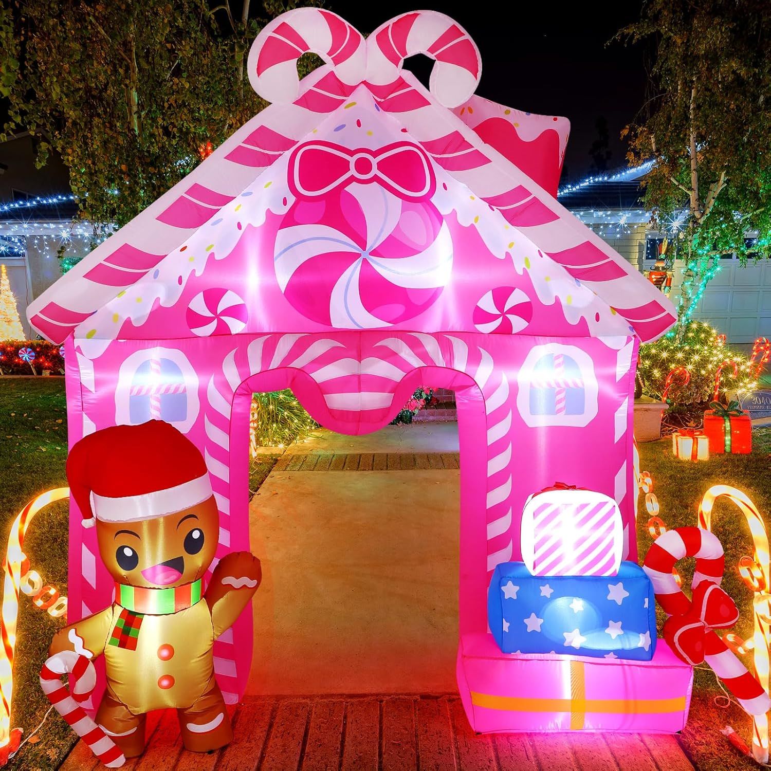 GREAT FOR FESTIVAL: 7 FT Christmas Inflatable Gingerbread House Archway perfect for christmas decor. Will add fun and color to your christmas and welcome your lovely neighborsBUILD-IN LED LIGHT: The christmas blow up decorations are designed with built in LED bulbs inside, which can light up your yard, patio, lawn or garden, and create a christmas atmosphere. It will be attractive and catch everyone's attention when it lights up in your yardHIGH QUALITY MATERIALS AND WATERPROOFING: Christmas inflatable is made of high-quality polyester fabric, high-strength waterproof. Maximizes the prevention of the risk of tearingEASY SET-UP AND USE: Just plug this christmas inflatable in, it has a built-in fan and in only seconds it will be fully inflated, then secure it to the ground.The inflatable comes with ropes and stakes to ensure the stability of the inflatables.Don't worry about inflatable will be blown away by the wind.AFTER SERVICE: If you're unsatisfied or have any problems with christmas blow up yard decoration please contact the seller through Amazon.