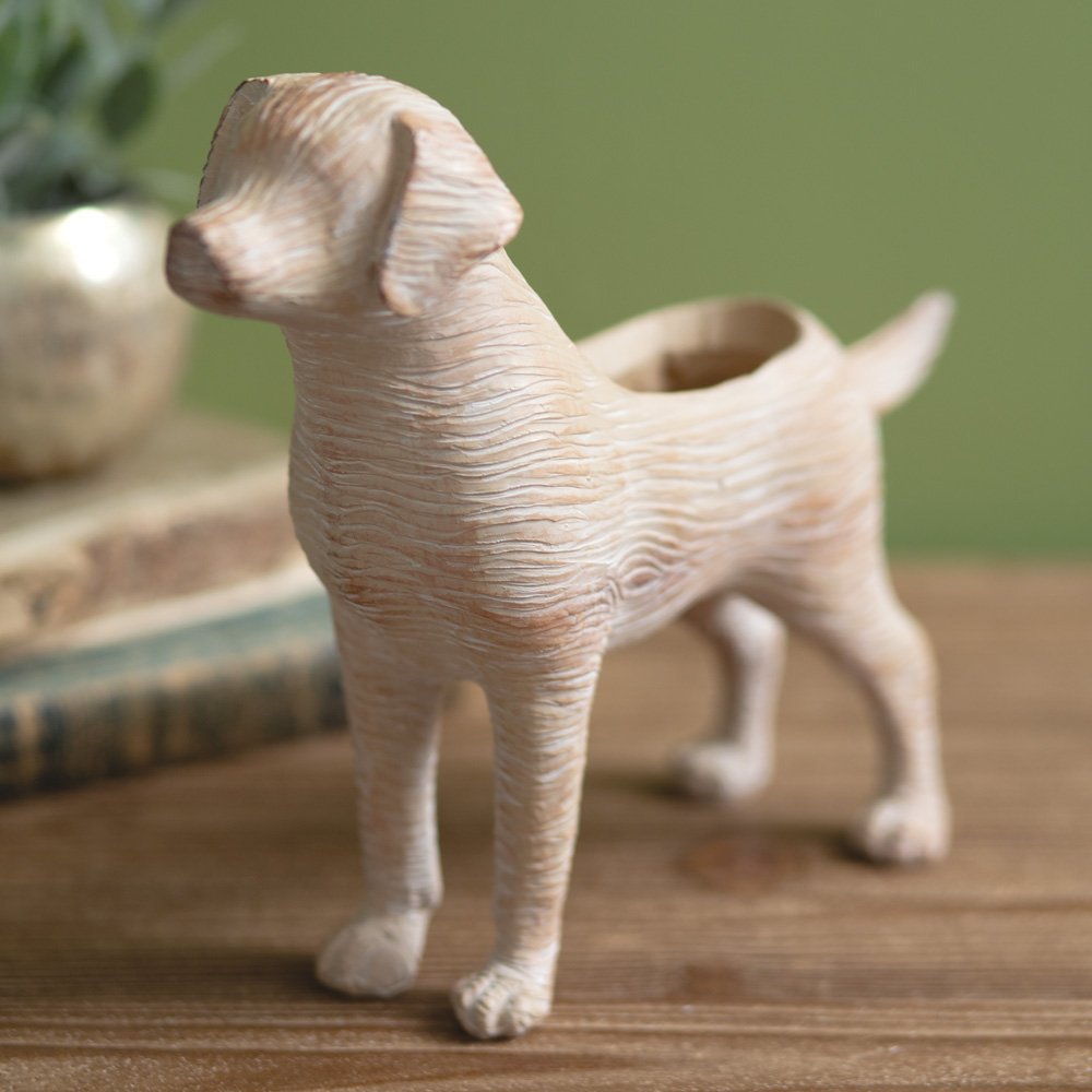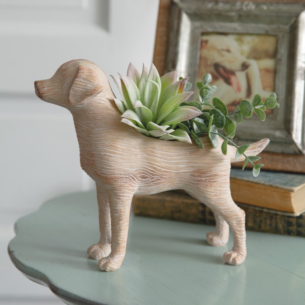 Our adorable planter displays the playful spirit of a puppy and lifelike details that will capture your heart. The hollowed back provides ample room for succulents, small flowers, or herbs. This item is crafted from resin and is waterproof.