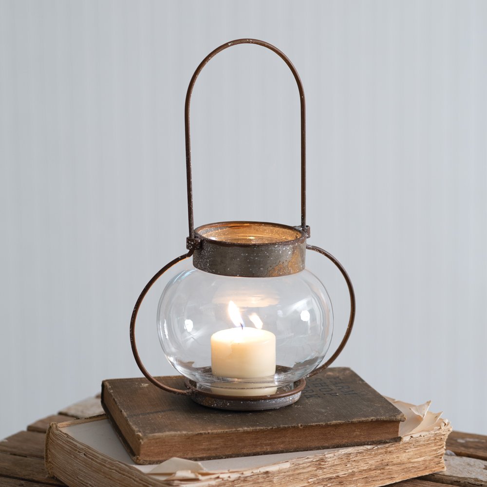 Item features a distressed metal finish and a glass bauble chimney. The opening for a candle is 2¾'' dia.