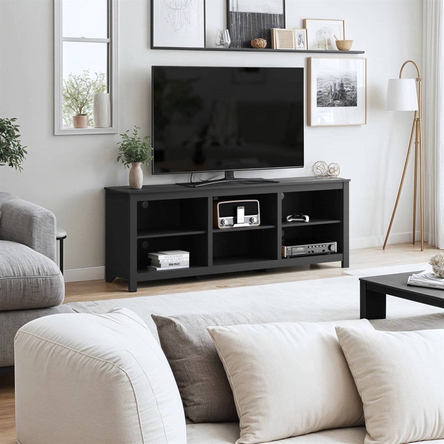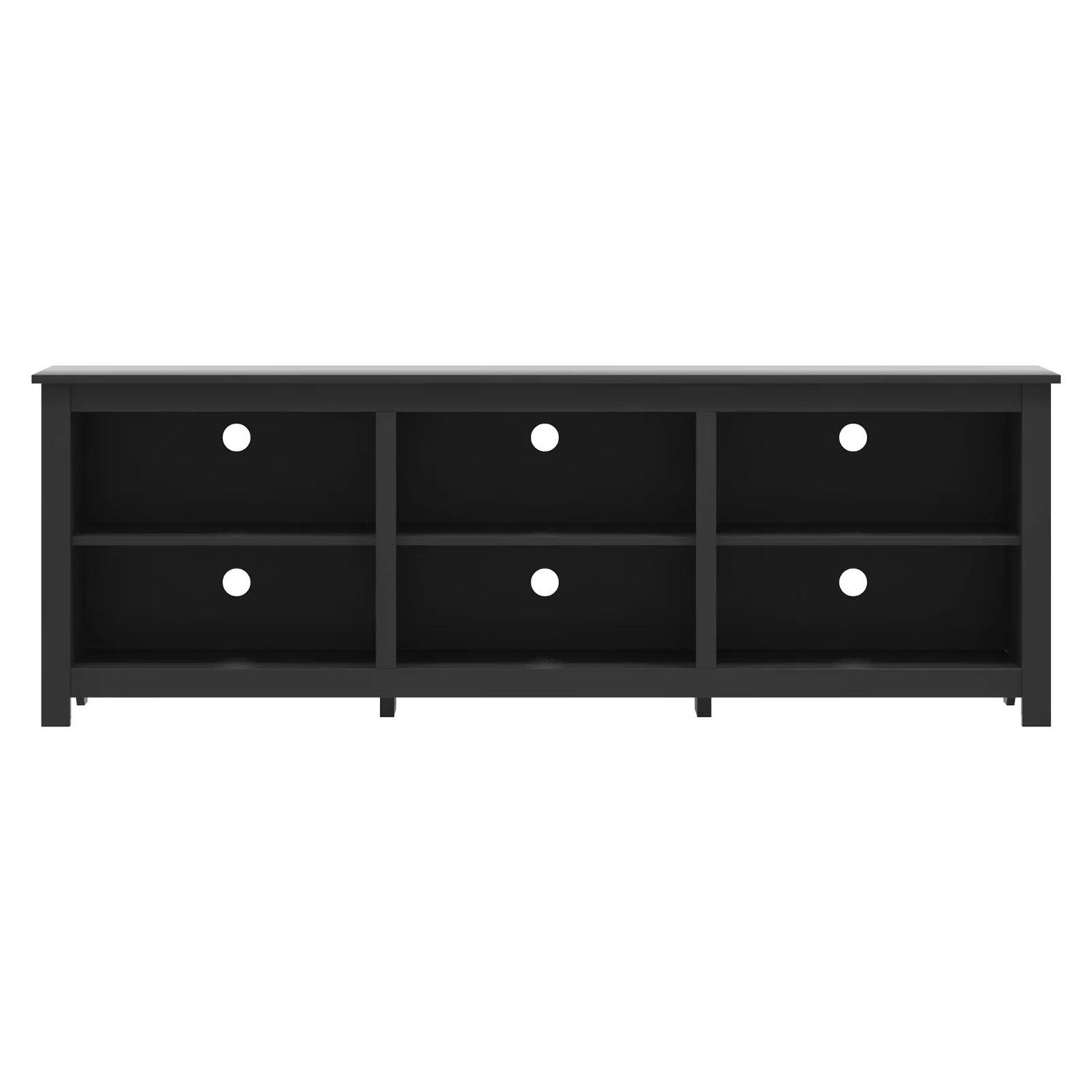 This Farmhouse TV Stand in Black Wood Finish - for TVs up to 70-inch offers a stylish and practical solution for your living room or den. Designed to accommodate TVs up to 70", it's crafted from engineered wood, offering a range of color options to fit your decor. With six open compartments, you can display your favorite books and decor items while keeping everything organized. The single cabinet with three interior shelves provides additional storage for media devices or games. Plus, the cable management system helps keep your space tidy by corralling those pesky wires. The natural venting ensures your electronics stay cool, making this stand a functional centerpiece for your entertainment area.