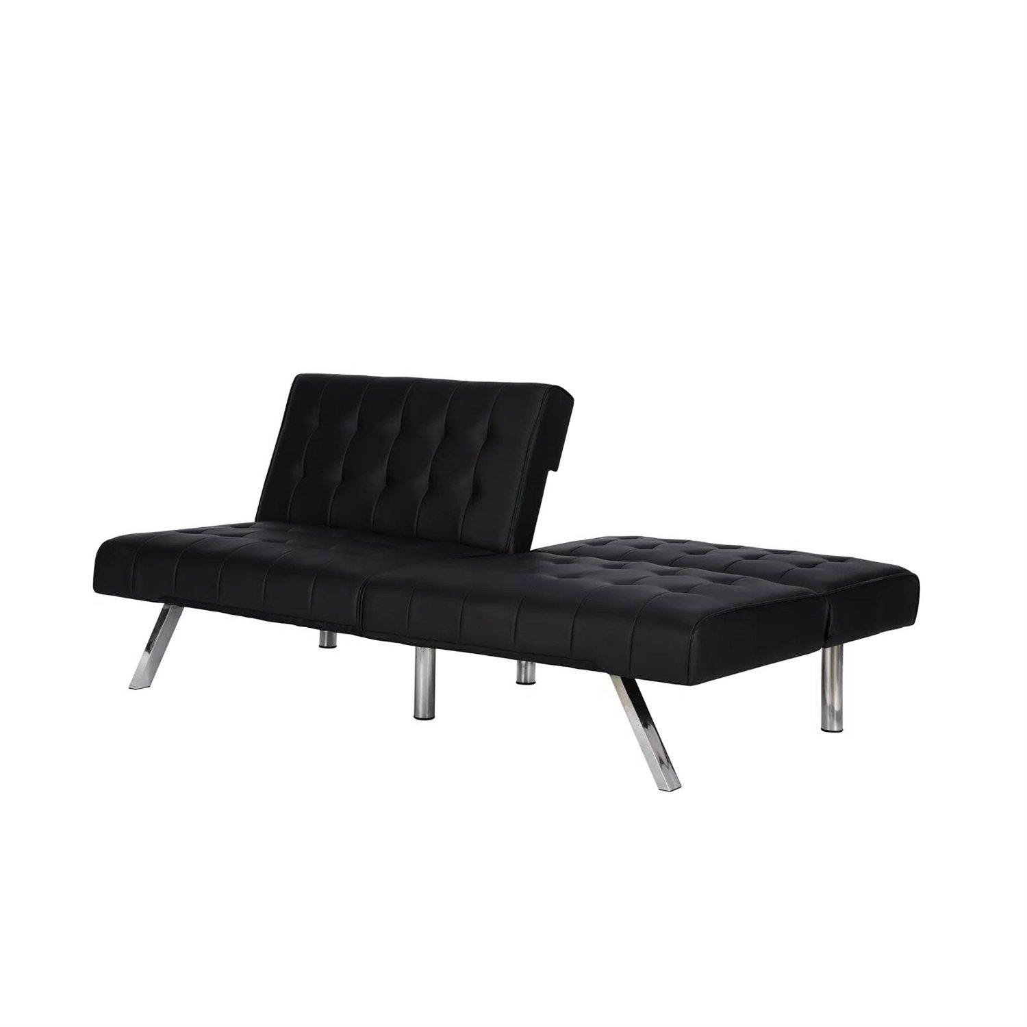 The Modern Black Faux Leather Upholstered Sleeper Sofa Bed is a striking piece that blends a modern look with a low-profile style. The tufted upholstery adds a classic touch and is available in faux leather, linen, and velvet in a variety of colors. The sleek slanted chrome legs add an exciting burst of shine that is perfect for any living space! Thanks to the sofa bed's convenient split back, you and your guest can easily adjust the futon to your comfort level—whether that’s sitting up to chat or lounging back to watch a favorite movie. You can also lie both sides flat for a comfortable sleeping spot for overnight guests. Its small profile means your futon can fit just about anywhere like your living room, home office, and even guest room, while always making a big statement!