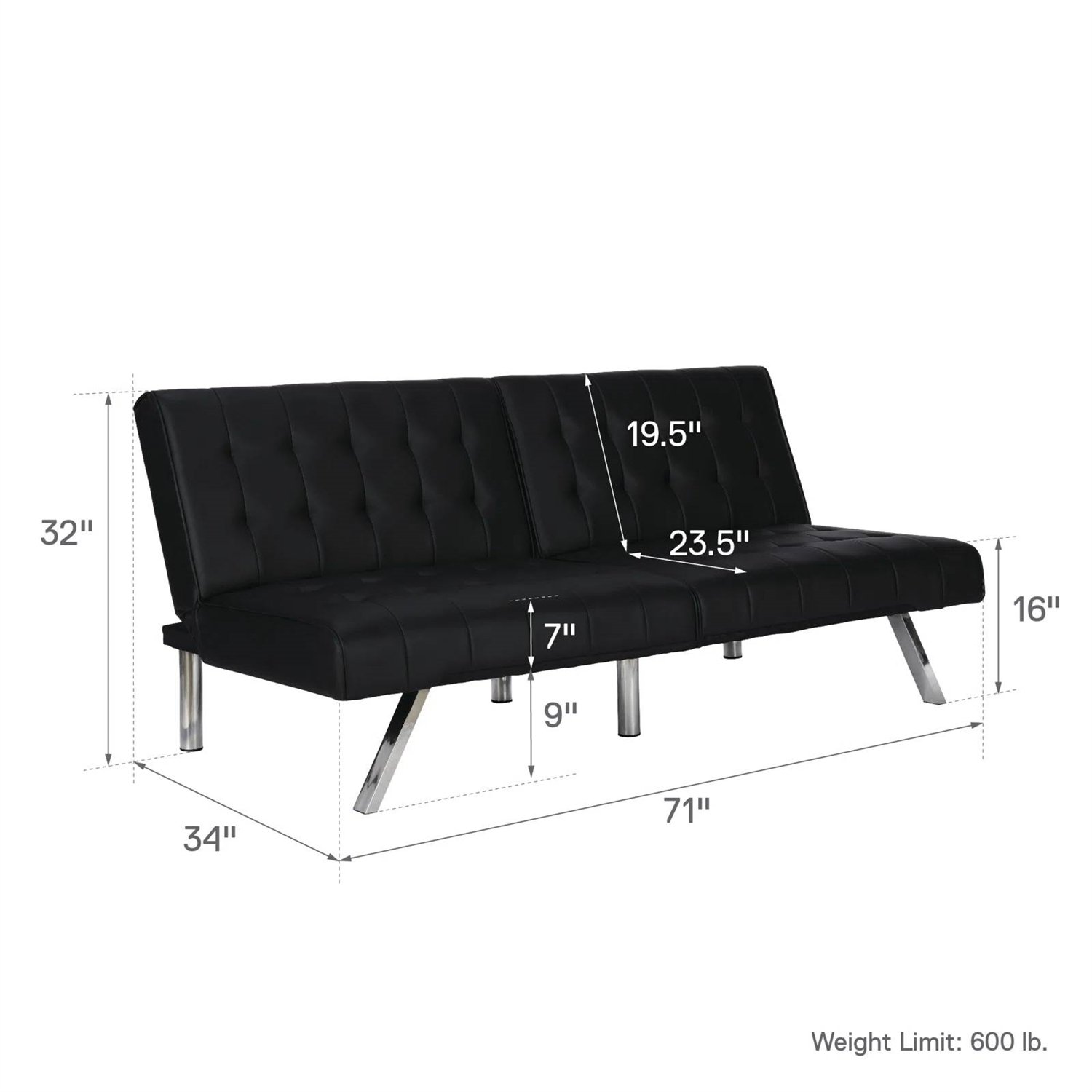 • Futon dimensions: 71” L x 34” W x 32” H. Sleeping dimensions: 71" L x 43" W x 16” H. Weight limit: 600 lb.