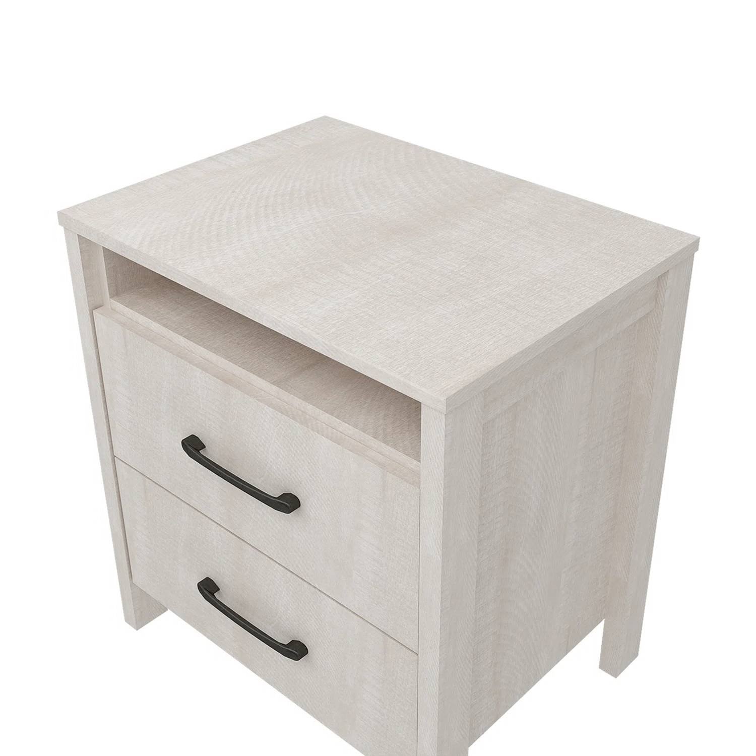 Bring modern minimalism to your bedroom with our Modern Farmhouse Bedroom 2-Drawer Bedside Table Nightstand in Grey Wood Finish. Crafted from durable manufactured wood, it features a clean-lined silhouette and straight block legs that complement any contemporary space. Two smooth-glide drawers offer hidden storage for books, remotes and nighttime essentials while the open shelf keeps daily items like an alarm clock, tissue box, diffuse, or glasses case within easy reach. The tabletop is ideal for a small lamp or plant, adding a simple decorative touch. Compact yet spacious, this bedside table fits perfectly in both large and small bedrooms.