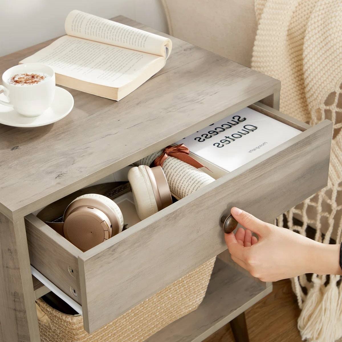 • Store what you need with a top surface for your lamp with a radiant glow, a drawer for your secrets, and an open compartment for your novels, you can keep all the bedtime essentials close at hand, and don’t need to get up when you’ve gotten under the covers.