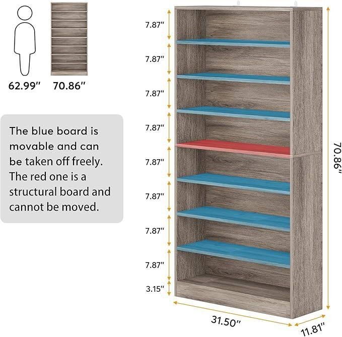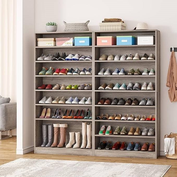 This 9 Tier Grey Wood Shoe Storage Cabinet, Hold Up To 45 Pairs is a MEGA shoe rack! Double up for extra storage. Can be also used to visually display your shoe boxes collection or pairs of limited edition shoes. This high and narrow shoe storage cabinet is an excellent "housekeeper" for your room, which save lots of horizontal space and at the same time take care of your shoes. This open shoes cabinet make it easy to place or get your shoes. Made from E1 particle board, this cabinet is sturdy and long-lasting. Non-slip foot pads keep it stable and protect your floor from scratches This functional shoe cabinet doesn't compromise on style; its concise, elegant look brings a touch of simplicity. The 8 versatile shelves can also store snacks or small decorations. Step by step guide and necessary tools are included.
