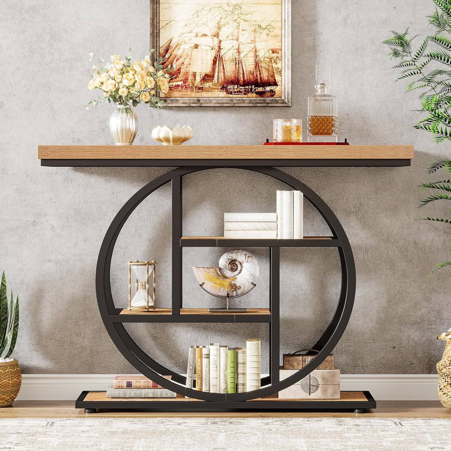 This Modern 41-inch Round Base Entryway Sofa Table with Brown Wood Finish Shelves featuring a circular base offers an industrial chic vibe with its rugged design. The brown finish of the table shelves exudes warmth and a vintage feel, while the central two shelves enclosed within a large circular metal frame create an eye-catching centerpiece in any hallway. The 1.57" thick tabletop, firmly held by a metal frame, provides a robust surface that can withstand up to 100 lbs. At dimensions of 11.8"D x 41.3"W x 31.5"H, it provides reliable support. Adjustable leg pads ensure stability on uneven floors, eliminating any wobble concerns. The console table features four staggered tiers providing ample storage and display spaces. From showcasing collectibles to arranging daily essentials, this table effectively merges functionality with aesthetics. This sofa table can seamlessly transition between a console table, tea table, entryway table, or even a TV stand, making it a perfect fit for any space – be it your living room, bedroom, study, or workshop. The accent sofa table's user-friendly design and clear instructions make setup a hassle-free process. Save precious time as you follow the simplified assembly steps and enjoy your new furniture piece in no time.