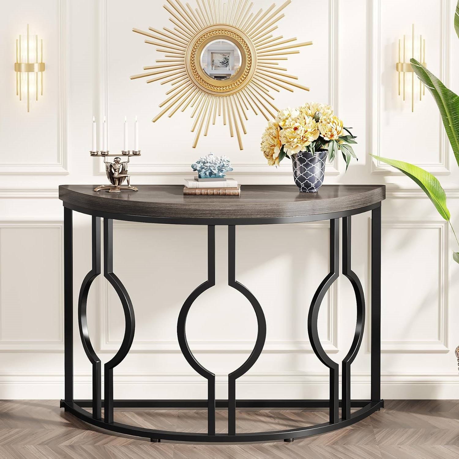 Admire this Modern 43-inch Half Moon Accent Sofa Table with Grey Wood Top Black Frame with a unique curved design accented by chic geometrical frames. Its dark distressed finish lends a retro-industrial charm, making this semi-circle table a perfect statement piece. Sized at 31.5''H x 43.3''L x 13.8''D, this slim accent table can fit in your foyer, hallway, or living room. It serves as a sofa couch table for lamps and books, a beautiful entryway table to hang a mirror above, or an exquisite end table for coffee. At 1.96” thickness, the retro textured manufactured wood displays an abstract texture with a smooth surface, perfect for display from sculptures to decorative vases. Maximum weight limit: 100 lbs. Made from durable wood, the table is scratch, stain-resistant and waterproof. The metal frame is powder-coated for wear and rust resistance. Adjustable foot pads ensure stability and prevent floor scratching. All required tools are included. Follow the detailed instructions to assemble this chic wood half-moon entry table in just 15 minutes. We also offer a 12-month guarantee and friendly customer service for a worry-free purchase.